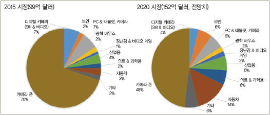반면, CIS를 선도하는 애플리케이션인 스마트폰은 2020년까지 연간 1%씩 성장하며 73억 달러 규모로 답보 상태를 기록할 것으로 전망됐다. 2015년도 전체 CIS 시장에서 스마트폰이 차지하는 비중이 70%였다면, 2020년에는 48%로 감소할 것으로 나타났다. PC와 태블릿 컴퓨터에서 사용하는 카메라 모듈에서의 CIS 규모는 2020년에 9.73억 달러로 전망됐다.
