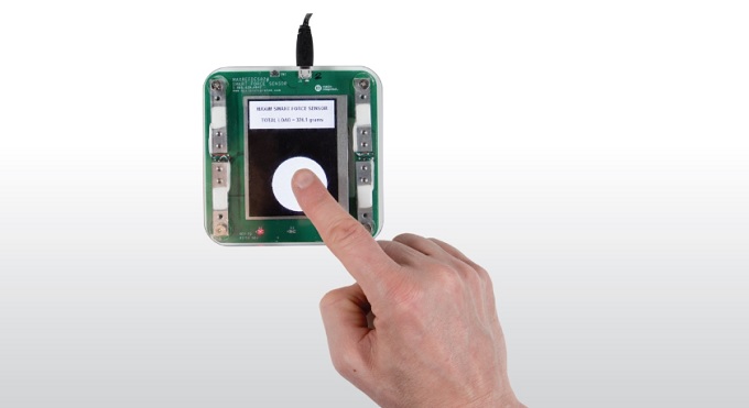 맥심 스마트 포스 센서 레퍼런스 설계 보드는 SPI 인터페이스에 24비트 , 6채널, 64ksps의 델타-시그마 MAX11254 ADC이다. 4개의 로드 셀이 4분면에 장착되어 평면 플라스틱 판에 가해지는 터치를 감지한다.