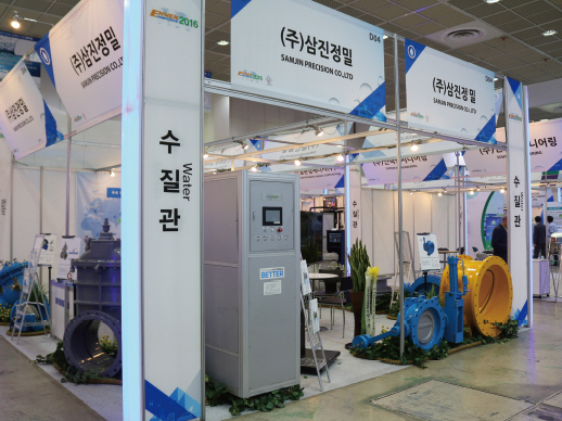 올해 국제환경산업기술 & 그린에너지전에 참가한 삼진정밀은 다양한 밸브류를 선보였는데, 그중에서도 공기 밸브 부착형 제수 밸브의 경우 양면 소프트 실 제수 밸브에 공기 밸브를 부착함으로써 관로의 공기를 원활하게 배출할 수 있어(75mm 공기 밸브 성능) 별도의 공기 밸브 설치가 필요 없다. 따라서 예산을 절감할 수 있고 공기 단축에 의한 민원 발생을 줄일 수 있다. 또한 기존의 제수 밸브는 밸브 몸통 상단에 압축 공기가 차서 밸브대, 보닛 등에 설치된 패킹, 오링 등을 압축 공기가 밀어내 누수의 원인이 되고 심한 경우 밸브 몸통이 파손되기도 했지만, 이 밸브는 몸통 내부 공기를 자동으로 배출시켜 수명을 연장시킨다. 공기 밸브 부착구를 통해 채수가 가능하므로 수질검사 시 편리하다. 특허를 받은 캡가이드의 경우, 압력이 높은 상태에서도 디스크 상하 작동이 안정적으로 실행되도록 하며, 디스크 작동 부분을 폴리카보네이트가 보호하고 있어 수명이 길다.