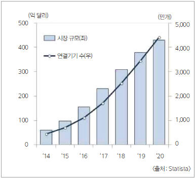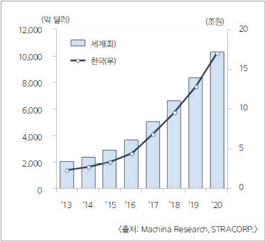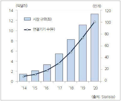 현대경제연구원의 최근 조사에 따르면 국내외 IoT 시장은 연평균 20% 이상의 고성장이 예상된다. 세계 IoT 시장 규모는 2015년 약 3천억달러에서 2020년 1조달러로 연평균 28.8% 성장 전망되고 있으며, 국내 IoT 시장 규모는 같은 기간 3조 3천억원에서 17조 원 규모로 연평균 38.5% 성장이 전망된다(표 1).
