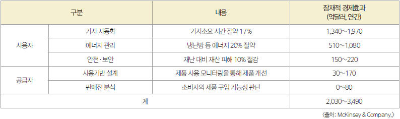 공급자 측면에서는 제품 활용도 모니터링을 통해 제품을 개선하는 사용기반 설계, 판매전 소비자의 제품 구입 가능성을 판단하는 분석 등을 통해 연간 30억달러~220억달러의 경제효과가 창출될 전망이다.