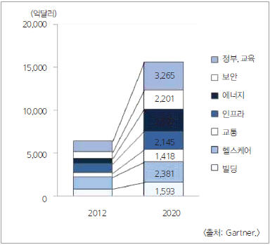 선진국 대도시로 인구 유입이 심화되고 신흥국의 급속화 도시화로 2020년까지 세계 인구의 58%에 해당하는 46억 인구가 도시지역에 거주할 것으로 예상된다. IoT 기반 스마트시티의 확산은 빌딩 관리 자동화, 지능화된 에너지 관리 시스템, 교통 인프라 효율화 등을 통해 부가가치를 창출할 것이다.