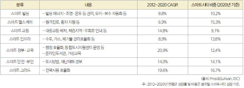 스마트시티란 도시행정, 교육, 복지 등 다양한 도시 부분에 ICT의 첨단 인프라가 적용되어 도시의 효율성을 제고하고 지속가능한 부가가치를 창출하는 도시다. 스마트빌딩, 스마트헬스케어, 스마트교통, 스마트인프라(유틸리티), 스마트 정부, 스마트 보안, 스마트그리드 등이 유기적으로 연결되어 지능형 서비스를 제공한다(표 7).
