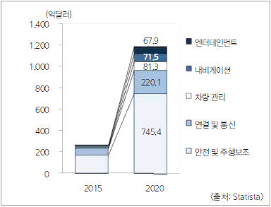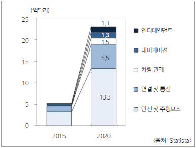 2020년 세계 커넥티트카 시장은 약 1,200억 달러 규모로 예상되며, 안전 및 주행보조 기능이 가장 큰 비중을 차지할 것이라고 현대경제연구원은 전망했다(표 8).