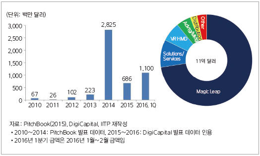 ▲ VR 및 AR 관련 투자 현황(2010년∼2015년 및 2016년 1분기)