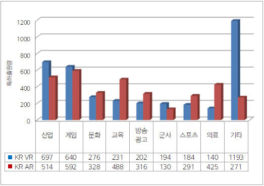 현실세계와 결합해서 직접적으로 상호작용을 구현하는 AR에 대한 특허출원은 교육(13.4%), 의료(11.6%), 문화(9.0%), 방송 및 광고(8.6%), 스포츠(8.0%) 분야 순으로 많았다. 반면에 3차원 모델링을 이용하며 가상세계와의 상호작용 및 몰입도가 중요한 VR에 대한 특허출원량은 산업(18.0%), 게임(17.0%), 군사(5.2%) 분야에서 AR보다 많은 것으로 조사됐다.