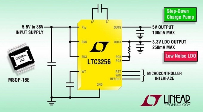리니어에 따르면, 이 디바이스는 5.5V ~ 38V에 이르는 폭넓은 입력전압 범위가 특징이며, 독립적으로 인에이블이 가능한 듀얼 출력을 포함한다. 5V 100mA 및 250mA 3.3V LDO(low-dropout) 레귤레이터로, 총 최대 출력 전류는 350mA이다.