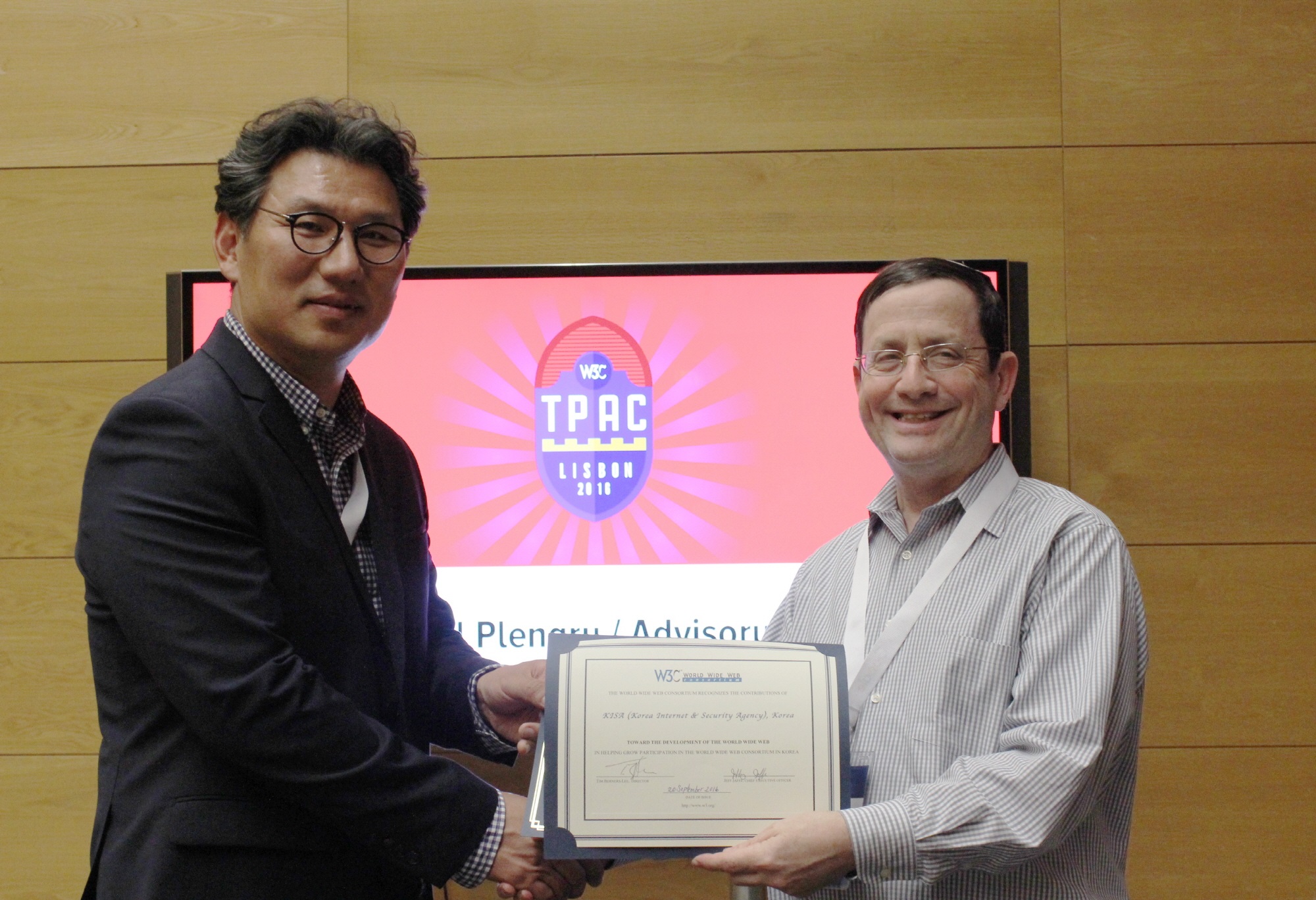 한국인터넷진흥원(KISA, 원장 백기승)이 최근 포르투갈 리스본에서 열린 국제 웹 표준화 단체(W3C)의 기술 표준 총회(TPAC 2016)에서 대한민국의 웹 표준화 확산 노력을 인정받아 공로상을 수상했다.