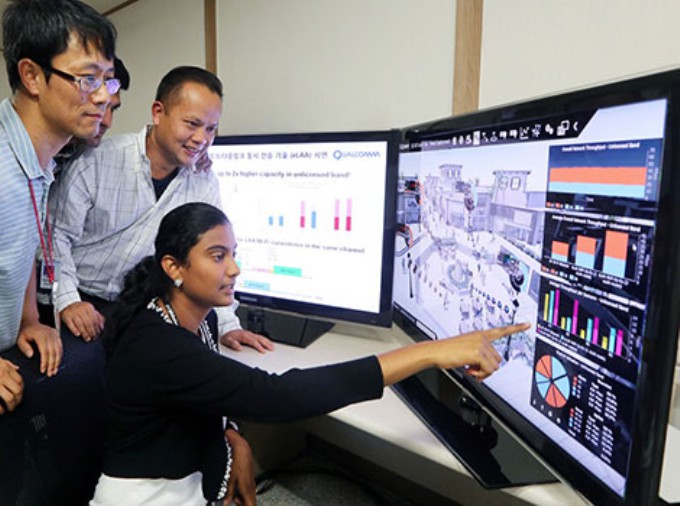 ▲SK텔레콤과 퀄컴의 연구원들이 29일 SK텔레콤 분당 기술원에서 LTE 용 주파수(면허대역)와 WiFi용 주파수(비면허대역)를 묶어서 업링크와 다운링크에 모두 이용하는 ‘비면허대역 주파수 집성‘ 기술을 실험하고 있다./SK텔레콤 제공