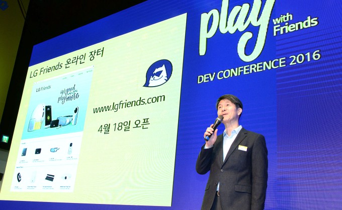 ▲지난 3월 상암 디지털미디어시티(DMC) 누리꿈 스퀘어에서 열린 ‘G5와 프렌즈 개발자 콘퍼런스’에서 조준호 LG전자 MC사업본부 사장이 참여자들에게 'G5'와 '프렌즈'를 선보이고, 개발 환경과 개발자 지원 프로그램 등을 소개했다 © News1
