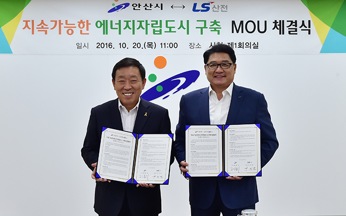 안산시와 LS산전은 20일, 안산시 본청에서 제종길 안산시장과 구자균 LS산전 회장이 참석한 가운데 ‘지속가능한 에너지자립도시 구축’을 위한 MOU(우호협력양해각서)를 체결하고 향후 사업 추진 계획을 논의했다.
