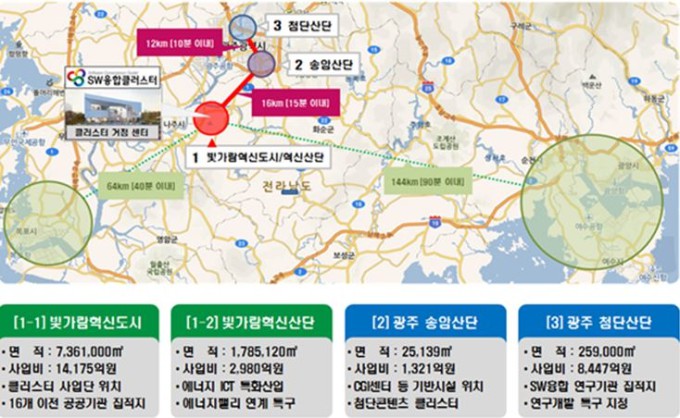 광주・전남 SW융합클러스터는 한전, 한전KDN 등 국내 에너지 분야 대표 공공기관과 관련 연구기관들이 참여해 나주혁신도시, 나주혁신산단, 광주 송암 산단과 첨단산단 등 4개 거점지역을 중심으로 조성될 계획이다.