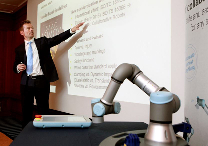 그렌드 인터콘티넨탈 호텔에서 최근 열린 기자간담회에서 유니버설로봇(UR) CTO 에스벤 오스터가드는 위험하거나 단조로운 반복 작업을 협업로봇이 대신 함으로써, 기존 작업자들은 더욱 창의적인 업무를 담당하게 되고 결과적으로 생산량의 향상과 효율적인 업무 배치가 가능하게 된다고 말했다.