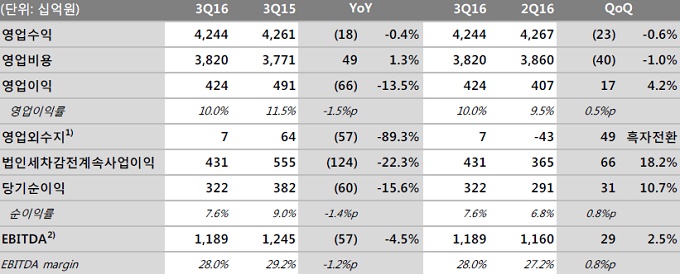 영업이익은 SK브로드밴드·SK플래닛 등 자회사 영업 실적 개선으로 전 분기 대비 4.2% 증가한 4243억 원을 기록했으며, EBITDA는 전 분기 대비 2.5% 증가한 1조 1886억 원을 기록했다.
