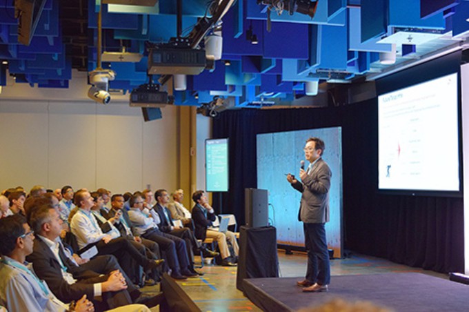 ▲2일 SK텔레콤 최진성 종합기술원장(TIP 의장)이 페이스북 본사에서 2017년 1분기 한국에 통신인프라 유망 벤처 발굴을 위한 벤처육성센터 설립 계획을 발표하고 있다