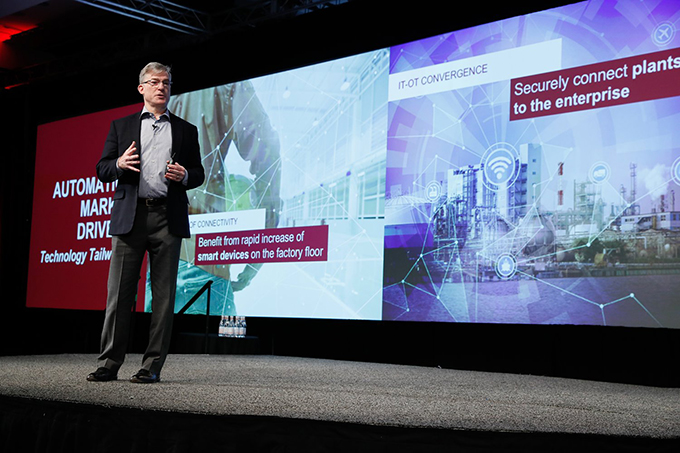 ▲ 제25회 오토메이션 페어에서 로크웰 오토메이션 블레이크 모렛 CEO가 IT와 OT 융합의 중요성을 설명하고 있다.