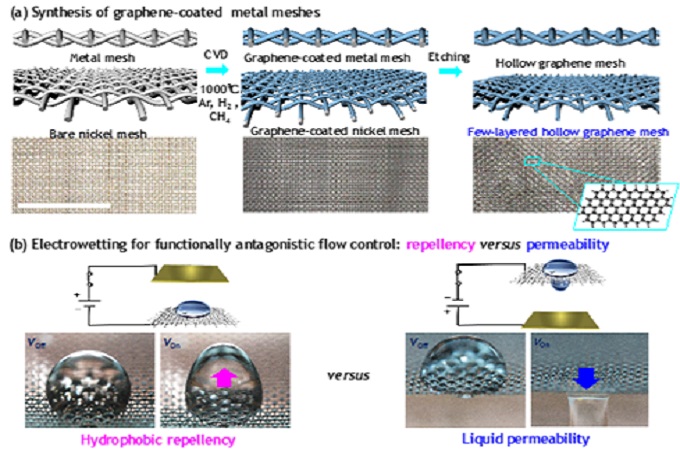 미래창조과학부는 그래핀이 코팅된 미세 금속 그물망을 이용하여 물의 움직임과 흐름을 전기로 자유롭게 제어하는 기술이 개발됐다고 밝혔다.