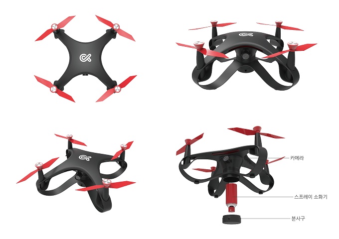 소화기 탑재형 드론은 드론 몸체에 작은 소화기를 부착한 것이다. 이 드론은 열 감지 기능을 통해 화재 위험요소를 제거하여 화재사고를 예방하고, 화재를 초기 단계에서 진압하는 것이다. 사용자는 드론에 신호를 보내 간단하게 소화기를 분사할 수 있다. 특히, 이 드론은 바람 같은 외부 힘을 받아도 평행 비행을 할 수 있도록 외부 압력을 분산하는 구조를 갖추고 있어 보다 정확하게 목표지점에 소화액을 분사할 수 있다.