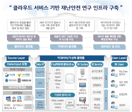 국립재난안전연구원 “클라우드 기반 재난안전 연구 인프라 구축” 사업은 재난의 대형화와 복합화로 인한 대량의 재난 데이터를 다각도로 분석 및 예측할 수 있는 기반을 제공하여 재난 대비 기술 고도화와 재난 안전 기술 연구개발의 허브센터로 구축된다.