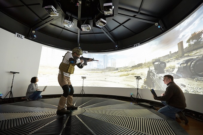 우선, ‘병사용 가상훈련 시스템’은 병사들에게 실전과 같이 몰입감이 높은 가상훈련 환경을 제공하기 위해 개발된 기술이다. 훈련자의 자세, 위치를 실시간으로 추적한 정보를 기반으로 제한된 공간 내에서 처음 가보는 지형지물 환경을 걷고 뛰며 군인들이 작전지역에 대한 사전 훈련이 가능한 기술이다.