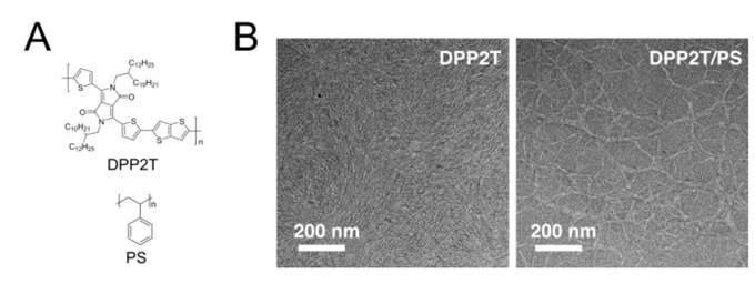 ▲ (A)DPP2T와 PS의 분자구조 (B)순수한 DPP2T 박막과 DPP2T/PS 박막의 투과전자현미경 사진(자료: 한국연구재단).
