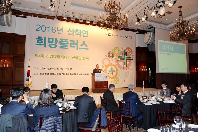 중소기업청은 12월 14일 임페리얼팰리스 호텔에서 산학연협력 기술개발사업을 통한 교류 증진과 새로운 도약의 장을 마련하기 위한 ‘2016년 산학연 희망플러스’ 행사를 개최했다.