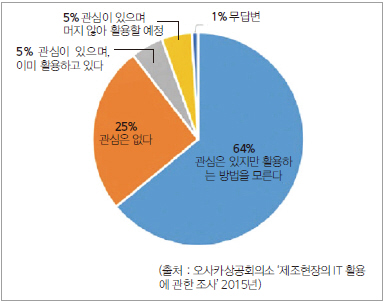 IoT 활용에 의해 생산성 향상, 부가가치가 높은 사업 영역 확대 등이 기대되고 있어 기업에서도 IoT에 대한 관심은 높다. 한편 중소기업에서는 활용 방법을 모르겠다는 목소리가 대다수를 차지한다. 오사카상공회의소가 실시한 조사에 따르면 자본금 5천만엔 이하 기업의 ‘IoT나 오픈 네트워크 등 IT기술 활용의 관심도’는 ‘관심은 있지만 활용하는 방법을 모른다’가 전체의 64%로 가장 많아 ‘이미 활용하고 있다’, ‘곧 활용할 예정’을 합한 10%를 크게 웃돌았다.