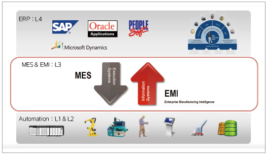 그리고 중간 부분에는 MES(Ma-nufacturing Execution System)와 EMI(Enterprise Manufacturing Intelligence)에 해당하는 2개의 화살표가 구축되어 있다. 아래로 향해 있는 화살표는 고객에게 수주한 정보를 통해서 현장에 자재 수급 및 생산 관련 지시사항들이 이루어지는 MES라는 제조 기술 시스템이 갖춰져 있다. 위로 향해 있는 화살표는 생산 현장에서 생산되는 결과물들, 즉 어떤 제품을 어떻게 생산했다고 하는 내용, 그리고 설비, 자산 효율, 데이터들이 다시 경영정보시스템으로 피드백되는 EMI라는 제조 기술 시스템이 있다.