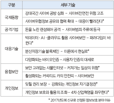 주요 이슈는 ▲강대국 간 사이버 공방 심화 - 사이버 전면전 위험 고조 ▲사이버 위협정보 공유와 협력 확대 - 대응이 빨라진다, ▲돈을 노린 랜섬웨어 공격 - 사이버범죄 주류에 등극 ▲빅데이터·AI·클라우드 활용 사이버보안 - 패러다임이 바뀐다 ▲분산저장기술 블록체인 - 이론에서 현실로 ▲다양화되는 바이오인증 - 사용자 인증의 대세로 ▲보안 고려 없는 사물인터넷 - 커져가는 일상의 위험 ▲활성화되는 커넥티드 카의 안전띠 - 사이버보안 ▲잊힐 권리 보장 - 강화되는 개인정보 자기결정권 ▲개인정보 보호와 활용의 조화 - 4차 산업혁명을 좌우한다 등이다.