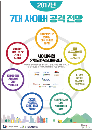 3개 기관이 공동으로 전문가 의견 수렴, ICT 종사자 대상 설문조사, 전문가 심층 인터뷰 등을 통해 선정한 ‘2017년 정보보호 10대 이슈’에 따르면 2017년 정보보호 분야는 보안의 지능화·서비스화·대중화로 인해 보안이 4차 산업혁명 플랫폼으로 자리 잡을 전망이다.