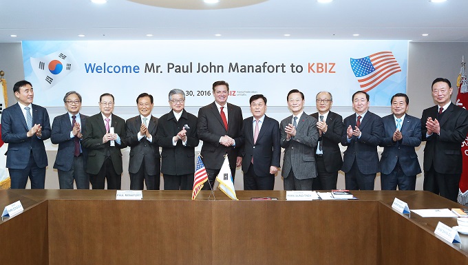 중소기업중앙회는 지난달 30일 미국 트럼프 대통령 당선자 캠프 선거대책위원장을 역임한 폴 매너포트와 중기중앙회 회의실에서 간담회를 가졌다고 밝혔다. 이날 간담회에는 박성택 중소기업중앙회장, 이흥우 중소기업중앙회 부회장, 김신길 중소기업중앙회 부회장 등 10여명의 중소기업인이 참석했다.