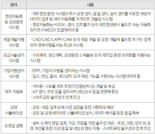 2016년 구축 사업에서 ‘에너지 솔루션 부분(FEMS)’을 제외한 나머지 지원 분야를 가지고 올해 지원 사업이 지속되고 있으며, 2017년 스마트공장 보급 확산 사업의 지원 분야는 표 1과 같이 다양하다. 즉, 기업자원관리시스템 및 공급사슬관리시스템(ERP와 SCM), 현장자동화 및 공장 운영 시스템(MES와 POP), 제조자동화(로봇 이용 포함), 제품개발 시스템(PDM/PLM/CAE 등 R&D 부분 지원 소프트웨어), IIoT를 이용한 공장 운영 혁신 분야, 공정시뮬레이션(단조/주조 분야 시뮬레이션 구축), 초정밀 금형 분야 등을 지원하고 있다.