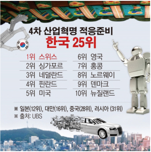 우리나라는 경제 규모가 세계 10위권 안에 들었음에도 불구하고, 세계경제포럼에서 진단한 4차 산업 준비 순위는 25위에 그쳤다(그림 1). 이는 범국가적으로 미래를 위한 산업 고도화에 주력하지 않는다면, 우리의 경제 성장 순위는 뒷걸음질할 수밖에 없다는 사실을 시사하고 있다고 생각된다.