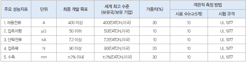 본 기술 개발의 목표는 구리 단자 인서트 사출성형한 고효율 인버터 PEBB용 커넥터 터미널(Connector Terminal)의 국산 개발이다. 본 개발로 절연성과 온도특성이 우수한 엔지니어링 플라스틱을 이용하여 생산성을 좋게 함으로써 원가 경쟁력이 있는 제품을 만들 수 있고, 다양한 설계 기능과 개발 능력을 보유함으로써 해외시장에서 선점할 수 있는 제품 개발에 대응할 수 있으며, 이를 통해 매출 상승과 고용 증진 효과가 기대된다.