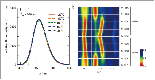 ▲ 그림 1. 형광체의 온도에 따른 발광 및 구조 변화 특성
