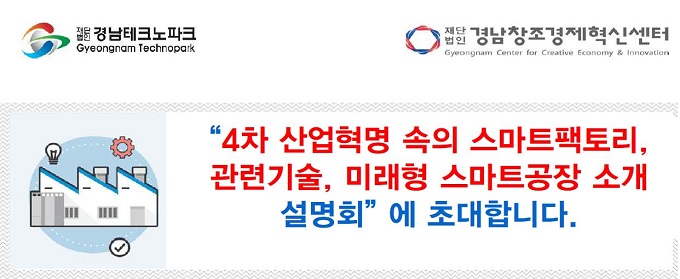 경남창조경제혁신센터와 경남테크노파크 정보산업진흥본부가 오는 7일 경남테크노파크 정보산업진흥본부 대회의실에서 경남지역 중소기업의 경쟁력 황보를 위해 '4차산업혁명 속의 스마트팩토리, 관련기술, 미래형 스마트공장 소개 설명회'를 개최한다.