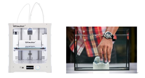 Ultimaker3(얼티메이커3, 사진 왼쪽)와 수용성 필라멘트 제거 중인 이미지.