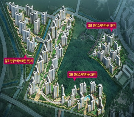 김포한강스카이타운은 김포한강신도시의 수요를 겨냥한 물량 중 하나. 김포한강스카이타운을 추진하고 있는 감정동 지역주택조합에 따르면, 총 5,214세대 3개 단지로 구축되며, 현재 1단지 635세대가 마감된 상태다. 2단지의 3,089세대는 분양 중이며, 3단지 1,390세대도 추후 일반분양 예정이라고 설명했다.