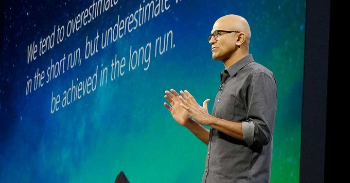 ▲ 이그나이트 2017에서 기조 연설을 진행하고 있는 사티아 나델라 마이크로소프트 CEO