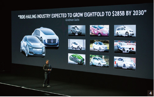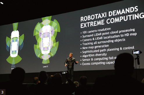 젠슨 황 CEO는 로봇택시를 현실화하는 것이 “굉장히 까다로운 작업”이라며, “로봇택시가 필요로 하는 연산력은 상당하다. 고해상도 360도 전방위 카메라, 레이더 및 라이다를 통해 주변을 인식하고, 센티미터 단위의 정확성으로 스스로의 위치를 파악하며, 주변의 차량 및 사람들의 움직임을 추적해 목적지까지 안전하고 편안한 경로를 계획해야 한다”고 설명했다.