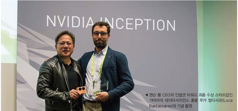 ▲ 젠슨 황 CEO와 인셉션 어워드 최종 수상 스타트업인 가마야의 데이터사이언스 총괄 루카 발다사르(Luca Baldassarre)의 기념 촬영