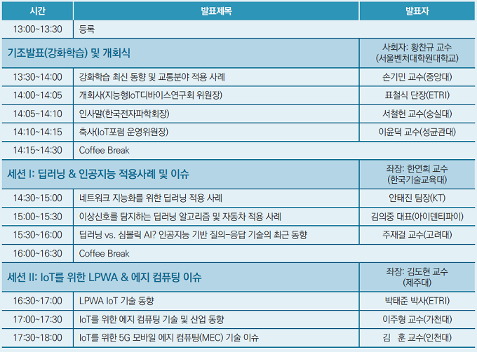 워크숍은 중앙대 손기민 교수의 ‘강화학습 최신 동향 및 교통분야 적용 사례’ 발표로 시작되며, 지능형IoT 디바이스연구회 표철식 위원장의 개회사, 한국전자파학회장인 서철헌 교수(숭실대)의 인사말, IoT포럼 운영위원장인 이윤덕 교수(성균관대)의 축사가 기조 세션을 채운다.