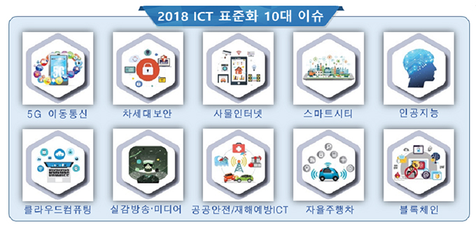 한국정보통신기술협회(이하 ‘TTA’)는 2018년 표준화를 통해 기술적 우위 확보와 시장 선점이 가능할 것으로 예상되는 주요 핵심 표준 분야에 대해서 ‘2018년 ICT 표준화 10대 이슈’를 선정하여 발표했다.