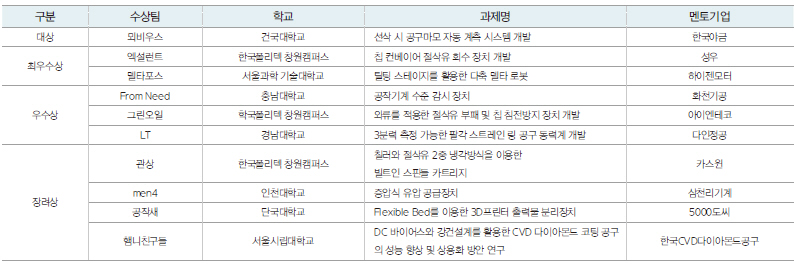이번 공모전에서는 건국대학교 뫼비우스팀이 ‘선삭 시 공구마모 자동 계측 시스템’ 개발로 대상의 영예를 안으며 산업통상자원부장관상을 수상하였다.
