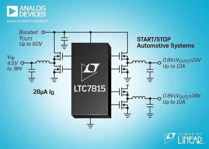 아나로그디바이스가 자동차 콜드 크랭크 조건에서 모든 출력 전압의 레귤레이션을 유지하는 고주파(최대 2.25MHz) 3중 출력(벅, 벅, 부스트) 동기식 DC/DC 컨트롤러 신제품 Power by Linear™ LTC7815를 출시한다.