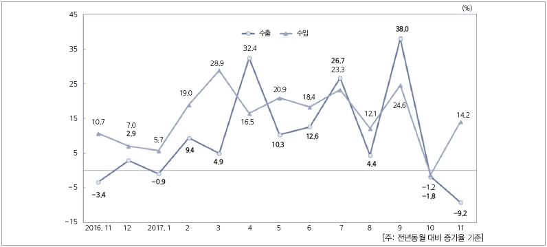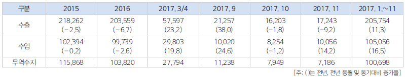 기계산업 수출은 전년동월 대비 9.2% 감소한 172.4억 달러를, 수입은 전년동월 대비 14.2% 증가한 100.6억 달러를 기록해 71.9억 달러의 무역수지 흑자를 냈다. 이와 관련, 본지에서는 한국기계산업진흥회 자본재공제조합의 ‘2017년 11월 기계산업 통계월보’를 바탕으로 기계산업 생산, 출하, 재고 동향 등을 정리했다.