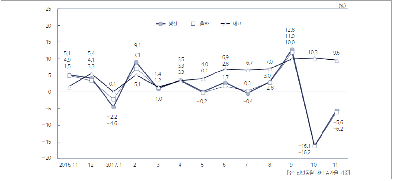 지난해 11월 기계산업 생산은 해상금속구조물, 소형승용차, 커넥터 중심으로 감소했다.