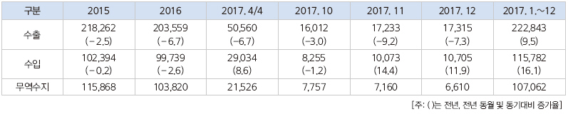 기계산업 수출은 전년동월 대비 7.3% 감소한 173.2억 달러를, 수입은 전년동월 대비 11.9% 증가한 107.1억 달러를 기록해 66.1억 달러의 무역수지 흑자를 냈다. 이와 관련, 본지에서는 한국기계산업진흥회 자본재공제조합의 ‘2017년 12월 기계산업 통계월보’를 바탕으로 기계산업 생산, 출하, 재고 동향 등을 정리했다.