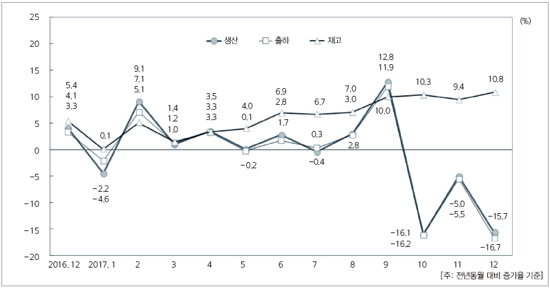 지난해 12월 기계산업 생산은 전년동월 대비 15.7% 감소했다. 정밀기계를 제외한 모든 업종에서 감소했다. 출하 또한 정밀기계만 유일하게 증가세를 보였다. 감소세는 전년동월 대비 16.7%다. 재고는 금속제품, 정밀기계를 제외한 모든 업종에서 증가하여 전년동월 대비 10.8% 증가했다.