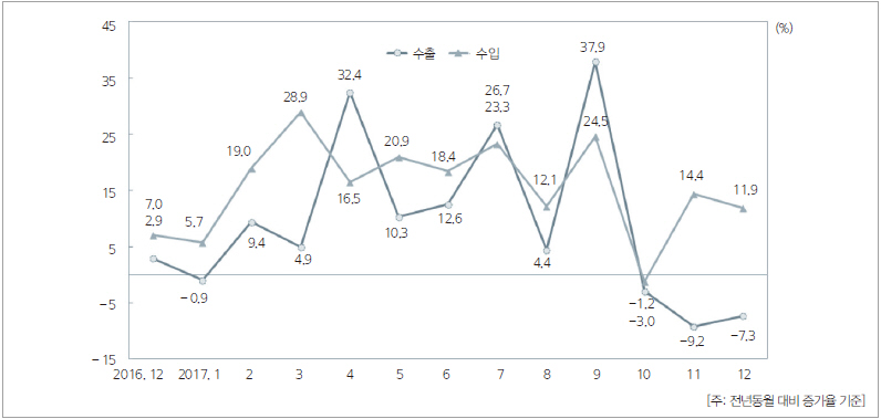 12월 기계산업 수출은 수송기계, 전기기계 업종에서 감소하여 전년동월 대비 7.3% 감소한 173.2억 달러를 기록했다. 국가별로는 영국(-57.9%), 미국(-23.0%), 중국(-16.0%)에서, 지역별로는 북미(-23.8%), 유럽(-17.3%)에서 감소했다.
